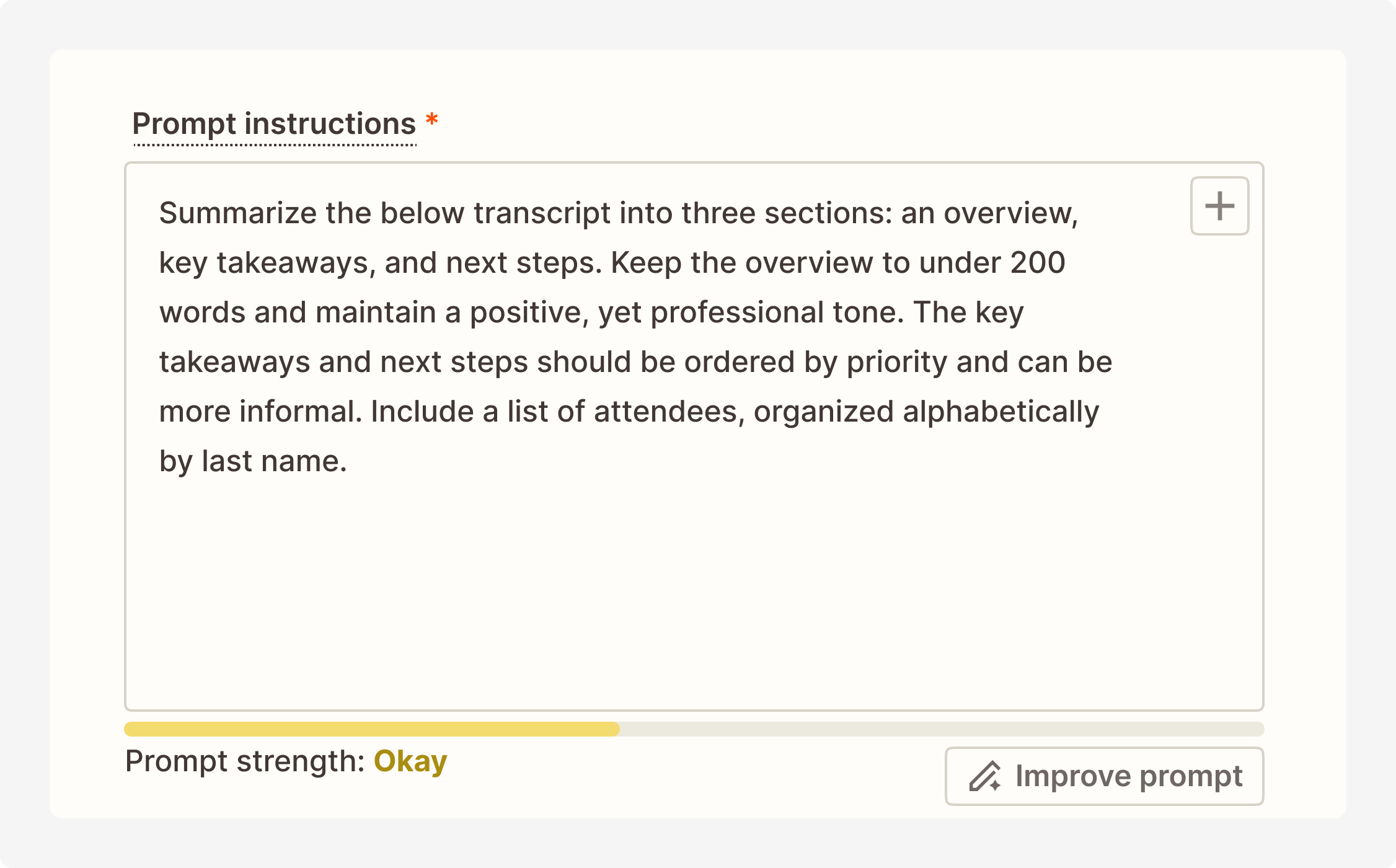 Prompt instructions field, with prompt strength and “Improve prompt” button