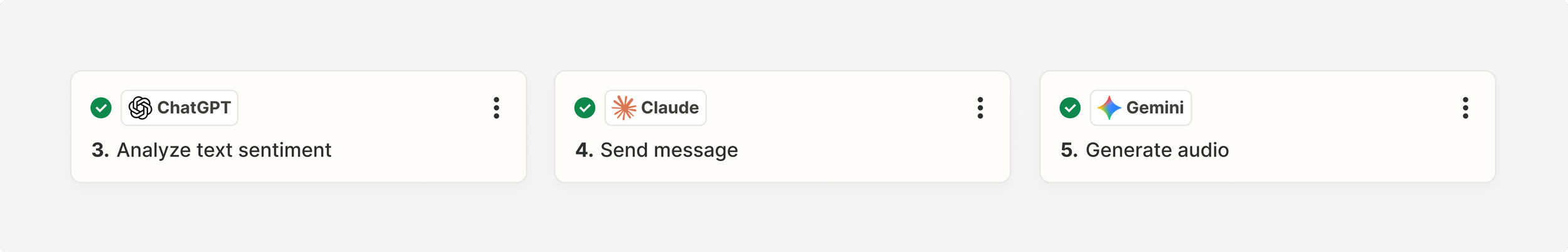 Examples of AI steps available from top AI apps on Zapier, including OpenAI (ChatGPT), Anthropic (Claude), and Google (Gemini)